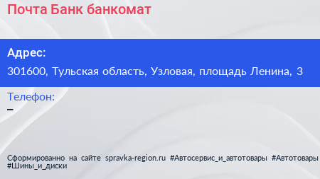 Почта Банк, банкомат по адресу 301600, Тульская область, Узловая, площадь Ленина, 3 в дальнейшем Организация, размещена в следующих категориях: