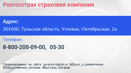 Росгосстрах, страховая компания по адресу 301600, Тульская область, Узловая, Октябрьская, 2а в дальнейшем Организация, размещена в следующих категориях: