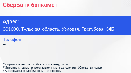 СберБанк, банкомат по адресу 301600, Тульская область, Узловая, Трегубова, 34Б в дальнейшем Организация, размещена в следующих категориях: