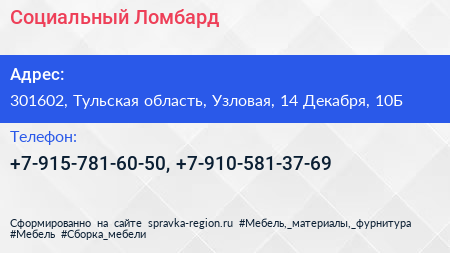 Социальный Ломбард по адресу 301602, Тульская область, Узловая, 14 Декабря, 10Б в дальнейшем Организация, размещена в следующих категориях: