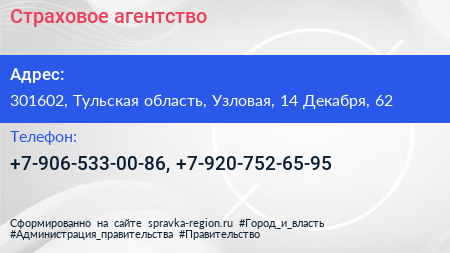 Страховое агентство по адресу 301602, Тульская область, Узловая, 14 Декабря, 62 в дальнейшем Организация, размещена в следующих категориях: