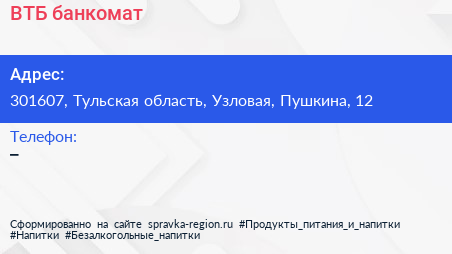 ВТБ, банкомат по адресу 301607, Тульская область, Узловая, Пушкина, 12 в дальнейшем Организация, размещена в следующих категориях:
