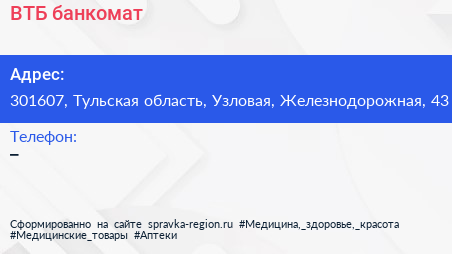 ВТБ, банкомат по адресу 301607, Тульская область, Узловая, Железнодорожная, 43 в дальнейшем Организация, размещена в следующих категориях: