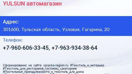 YULSUN, автомагазин по адресу 301600, Тульская область, Узловая, Гагарина, 20 в дальнейшем Организация, размещена в следующих категориях: