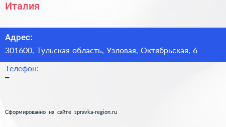 Италия по адресу 301600, Тульская область, Узловая, Октябрьская, 6 в дальнейшем Организация, размещена в следующих категориях:
