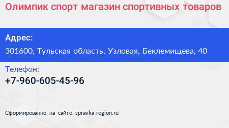 Олимпик спорт, магазин спортивных товаров по адресу 301600, Тульская область, Узловая, Беклемищева, 40 в дальнейшем Организация, размещена в следующих категориях: