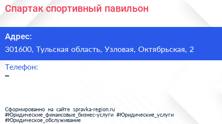 Спартак, спортивный павильон по адресу 301600, Тульская область, Узловая, Октябрьская, 2 в дальнейшем Организация, размещена в следующих категориях:
