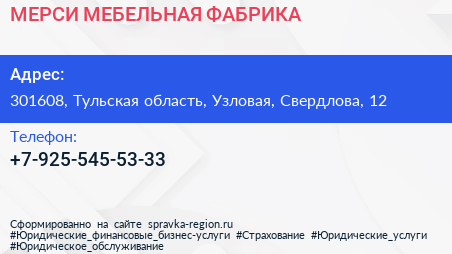 МЕРСИ МЕБЕЛЬНАЯ ФАБРИКА по адресу 301608, Тульская область, Узловая, Свердлова, 12 в дальнейшем Организация, размещена в следующих категориях: