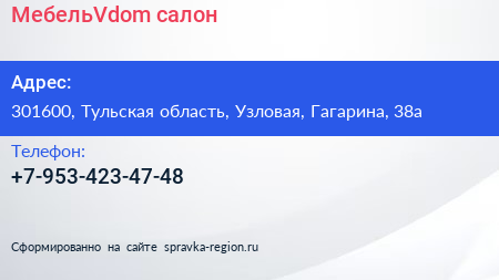 МебельVdom, салон по адресу 301600, Тульская область, Узловая, Гагарина, 38а в дальнейшем Организация, размещена в следующих категориях: