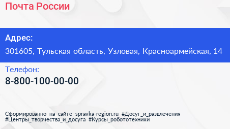 Почта России по адресу 301605, Тульская область, Узловая, Красноармейская, 14 в дальнейшем Организация, размещена в следующих категориях: