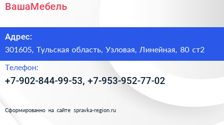 ВашаМебель по адресу 301605, Тульская область, Узловая, Линейная, 80 ст2 в дальнейшем Организация, размещена в следующих категориях:
