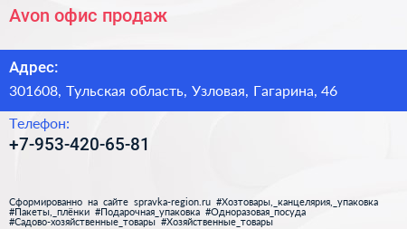 Avon, офис продаж по адресу 301608, Тульская область, Узловая, Гагарина, 46 в дальнейшем Организация, размещена в следующих категориях: