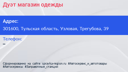 Дуэт, магазин одежды по адресу 301600, Тульская область, Узловая, Трегубова, 39 в дальнейшем Организация, размещена в следующих категориях: