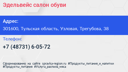 Эдельвейс, салон обуви по адресу 301600, Тульская область, Узловая, Трегубова, 38 в дальнейшем Организация, размещена в следующих категориях: