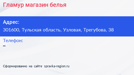 Гламур, магазин белья по адресу 301600, Тульская область, Узловая, Трегубова, 38 в дальнейшем Организация, размещена в следующих категориях: