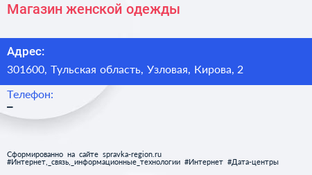 Магазин женской одежды по адресу 301600, Тульская область, Узловая, Кирова, 2 в дальнейшем Организация, размещена в следующих категориях: