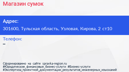 Магазин сумок по адресу 301600, Тульская область, Узловая, Кирова, 2 ст10 в дальнейшем Организация, размещена в следующих категориях: