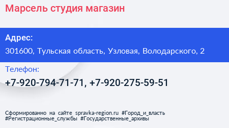 Марсель, студия-магазин по адресу 301600, Тульская область, Узловая, Володарского, 2 в дальнейшем Организация, размещена в следующих категориях: