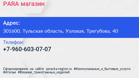 PARA, магазин по адресу 301600, Тульская область, Узловая, Трегубова, 40 в дальнейшем Организация, размещена в следующих категориях: