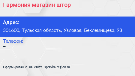Гармония, магазин штор по адресу 301600, Тульская область, Узловая, Беклемищева, 93 в дальнейшем Организация, размещена в следующих категориях: