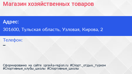 Магазин хозяйственных товаров по адресу 301600, Тульская область, Узловая, Кирова, 2 в дальнейшем Организация, размещена в следующих категориях: