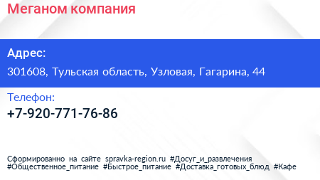 Меганом, компания по адресу 301608, Тульская область, Узловая, Гагарина, 44 в дальнейшем Организация, размещена в следующих категориях: