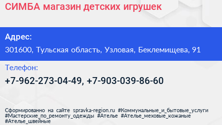 СИМБА, магазин детских игрушек по адресу 301600, Тульская область, Узловая, Беклемищева, 91 в дальнейшем Организация, размещена в следующих категориях: