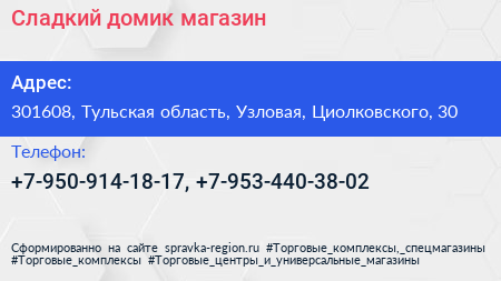 Сладкий домик, магазин по адресу 301608, Тульская область, Узловая, Циолковского, 30 в дальнейшем Организация, размещена в следующих категориях: