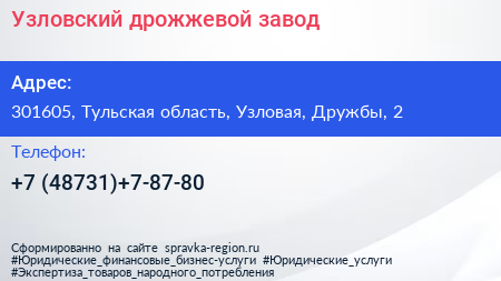 Узловский дрожжевой завод по адресу 301605, Тульская область, Узловая, Дружбы, 2 в дальнейшем Организация, размещена в следующих категориях: