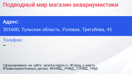 Подводный мир, магазин аквариумистики по адресу 301600, Тульская область, Узловая, Трегубова, 41 в дальнейшем Организация, размещена в следующих категориях: