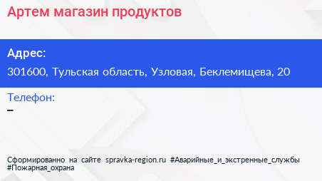 Артем, магазин продуктов по адресу 301600, Тульская область, Узловая, Беклемищева, 20 в дальнейшем Организация, размещена в следующих категориях:
