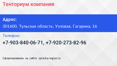 Тенториум, компания по адресу 301600, Тульская область, Узловая, Гагарина, 16 в дальнейшем Организация, размещена в следующих категориях: