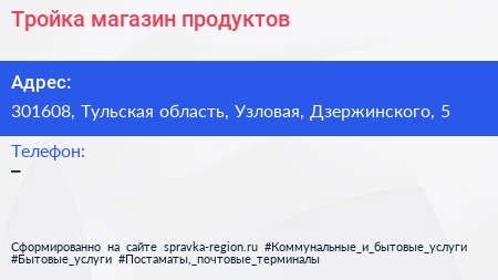 Тройка, магазин продуктов по адресу 301608, Тульская область, Узловая, Дзержинского, 5 в дальнейшем Организация, размещена в следующих категориях: