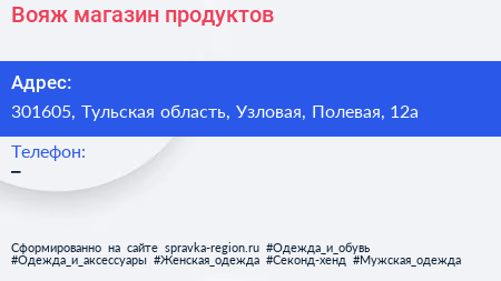 Вояж, магазин продуктов по адресу 301605, Тульская область, Узловая, Полевая, 12а в дальнейшем Организация, размещена в следующих категориях: