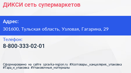 ДИКСИ, сеть супермаркетов по адресу 301600, Тульская область, Узловая, Гагарина, 29 в дальнейшем Организация, размещена в следующих категориях: