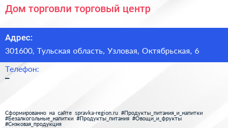 Дом торговли, торговый центр по адресу 301600, Тульская область, Узловая, Октябрьская, 6 в дальнейшем Организация, размещена в следующих категориях: