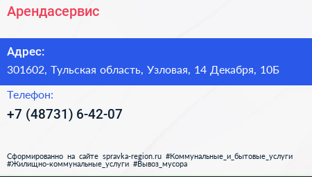 Арендасервис по адресу 301602, Тульская область, Узловая, 14 Декабря, 10Б в дальнейшем Организация, размещена в следующих категориях: