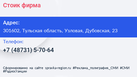 Стоик, фирма по адресу 301602, Тульская область, Узловая, Дубовская, 23 в дальнейшем Организация, размещена в следующих категориях: