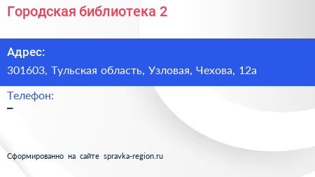 Городская библиотека №2 по адресу 301603, Тульская область, Узловая, Чехова, 12а в дальнейшем Организация, размещена в следующих категориях: