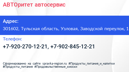АВТОритет, автосервис по адресу 301602, Тульская область, Узловая, Заводской переулок, 1 в дальнейшем Организация, размещена в следующих категориях: