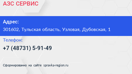 АЗС СЕРВИС по адресу 301602, Тульская область, Узловая, Дубовская, 1 в дальнейшем Организация, размещена в следующих категориях: