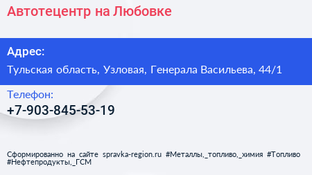 Автотецентр на Любовке по адресу Тульская область, Узловая, Генерала Васильева, 44/1 в дальнейшем Организация, размещена в следующих категориях: