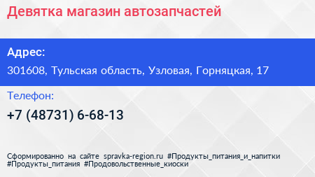 Девятка, магазин автозапчастей по адресу 301608, Тульская область, Узловая, Горняцкая, 17 в дальнейшем Организация, размещена в следующих категориях: