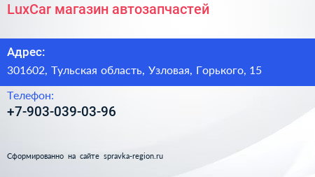 LuxCar, магазин автозапчастей по адресу 301602, Тульская область, Узловая, Горького, 15 в дальнейшем Организация, размещена в следующих категориях: