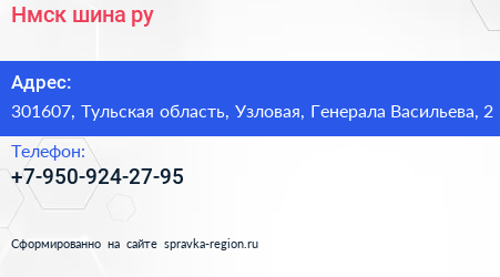 Нмск-шина.ру по адресу 301607, Тульская область, Узловая, Генерала Васильева, 2 в дальнейшем Организация, размещена в следующих категориях: