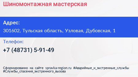 Шиномонтажная мастерская по адресу 301602, Тульская область, Узловая, Дубовская, 1 в дальнейшем Организация, размещена в следующих категориях: