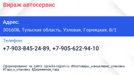Вираж, автосервис по адресу 301608, Тульская область, Узловая, Горняцкая, 8/1 в дальнейшем Организация, размещена в следующих категориях: