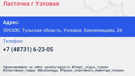 Ласточка, г. Узловая по адресу 301600, Тульская область, Узловая, Беклемищева, 26 в дальнейшем Организация, размещена в следующих категориях: