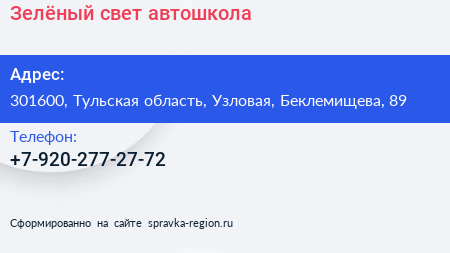 Зелёный свет, автошкола по адресу 301600, Тульская область, Узловая, Беклемищева, 89 в дальнейшем Организация, размещена в следующих категориях: