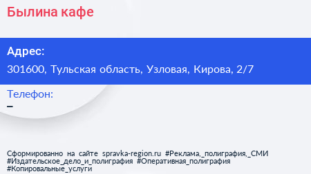 Былина, кафе по адресу 301600, Тульская область, Узловая, Кирова, 2/7 в дальнейшем Организация, размещена в следующих категориях:
